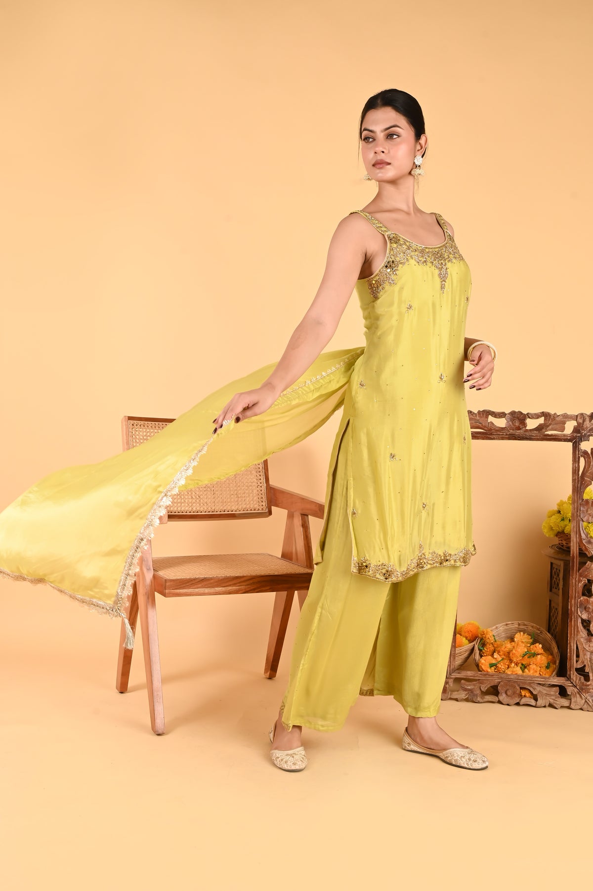 Illuminate your festive moments with our Lime Green Hand-Embellished Kurta Set, a radiant ensemble that blends effortless grace with timeless elegance. Crafted from luxurious silk fabric, this three-piece set exudes a soft sheen that enhances the beauty of its vibrant lime hue.