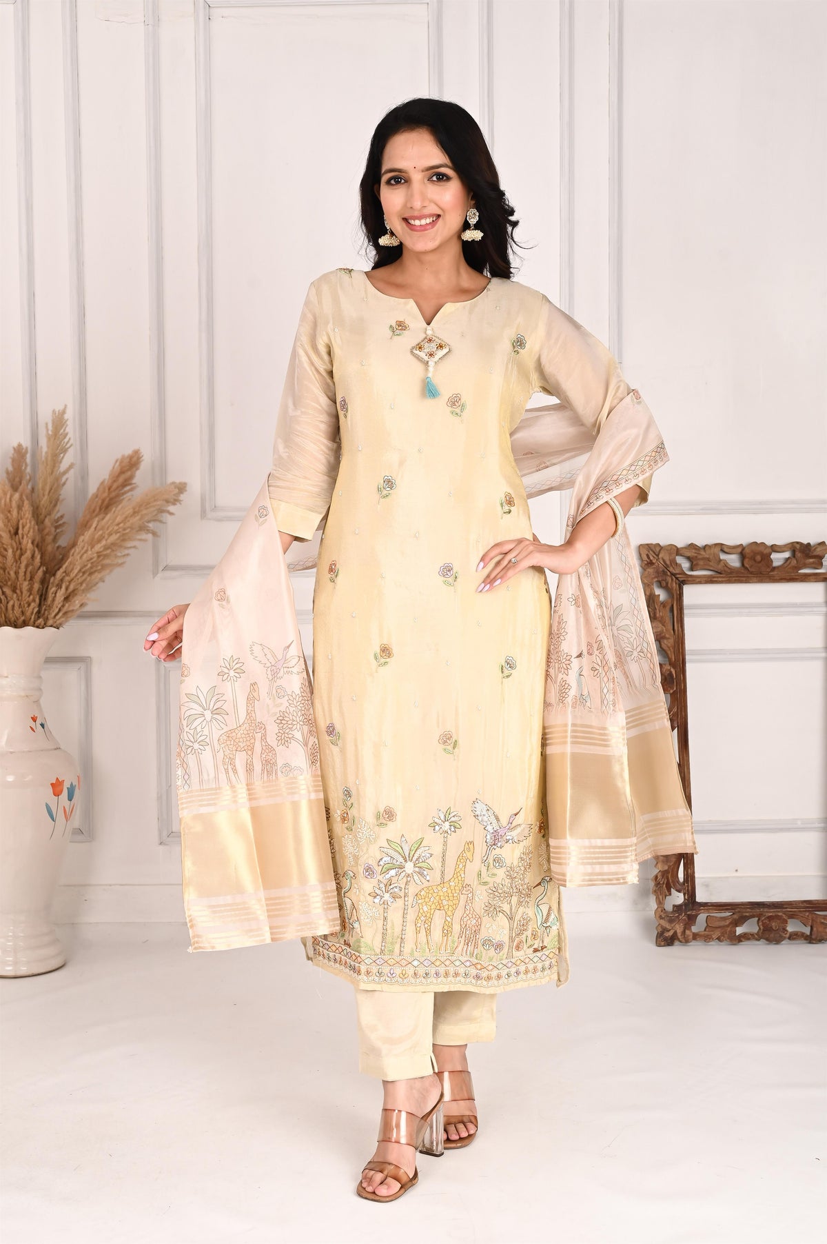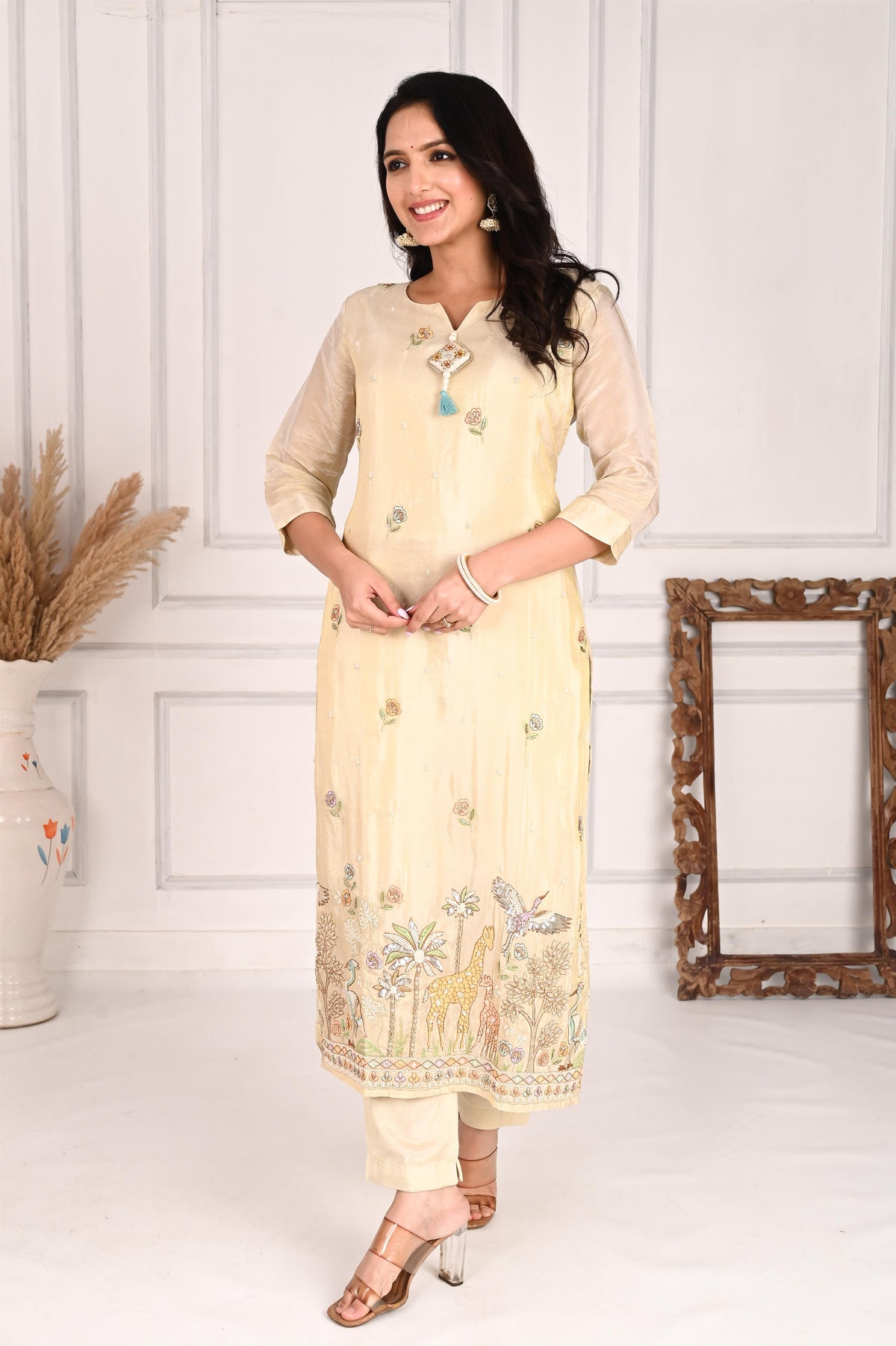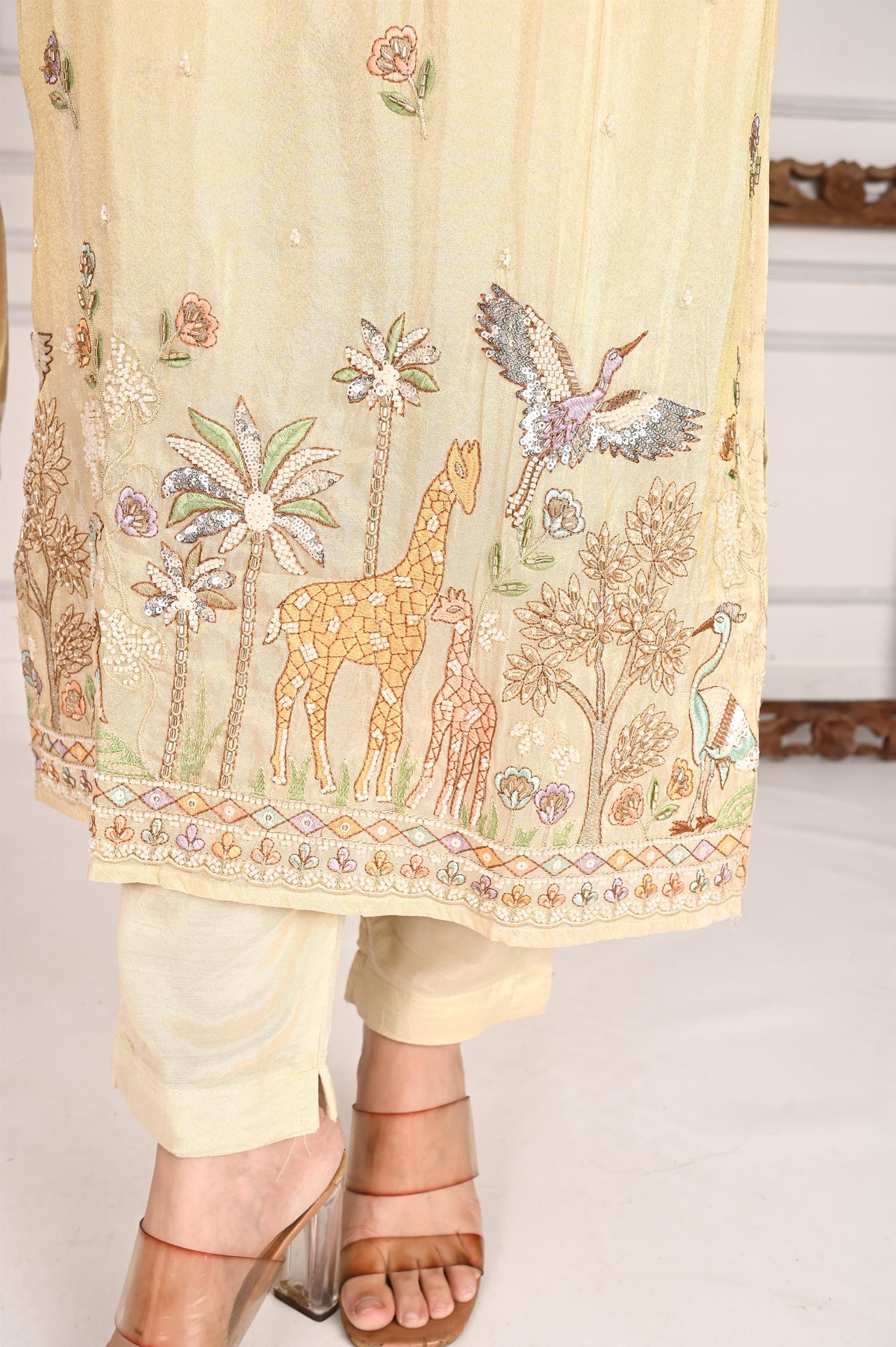Cream Beige Wildlife Embroidered Kurta Set showcases a straight-cut cream kurta in lustrous silk-blend fabric, adorned with delicate pastel floral and animal embroidery scattered across the body and lavishly detailed along the hem. A statement wildlife-themed organza dupatta, featuring giraffes and birds in multicolor threadwork, adds an artistic touch and ethereal drape. The kurta is paired with tailored pants in matching cream for a sleek silhouette. Perfect for festive occasions and elegant daytime gatherings, this ensemble blends whimsical motifs with refined finesse.