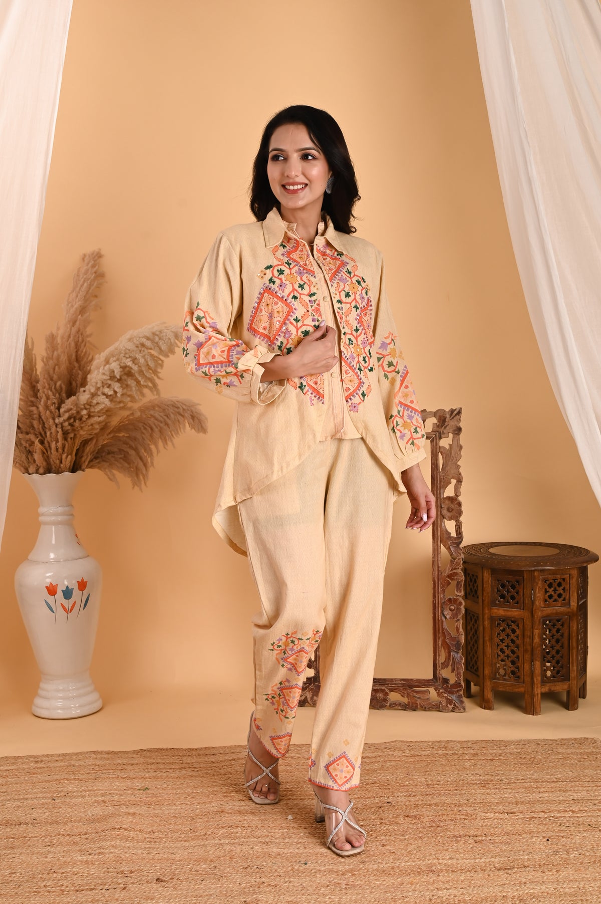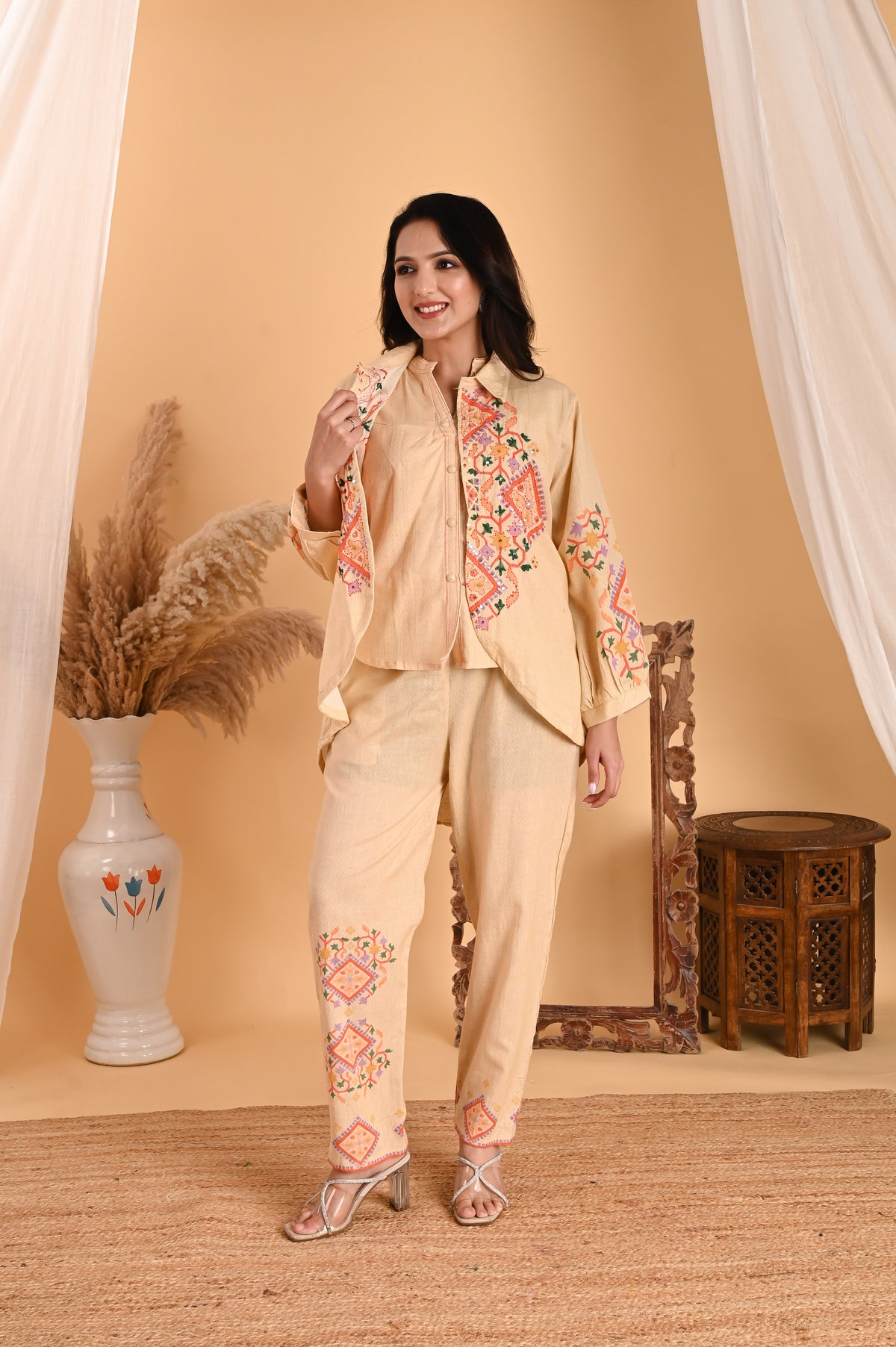 Step into sophistication with this elegant beige 3 Piece co-ord set, crafted from soft, breathable cotton for all-day comfort. The shirt features an intricate multicolor embroidered design that celebrates traditional artisan patterns, with vibrant motifs in orange, yellow, lavender, and green accenting the front, sleeves, and pant cuffs for a striking, cohesive look.