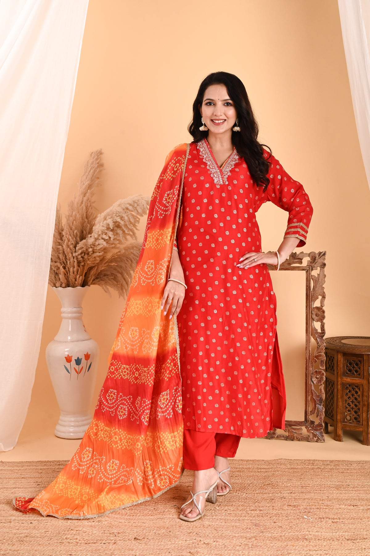 NR-107/ Red Bandhani Printed Kurta Set with Embroidery & Ombre Dupatta